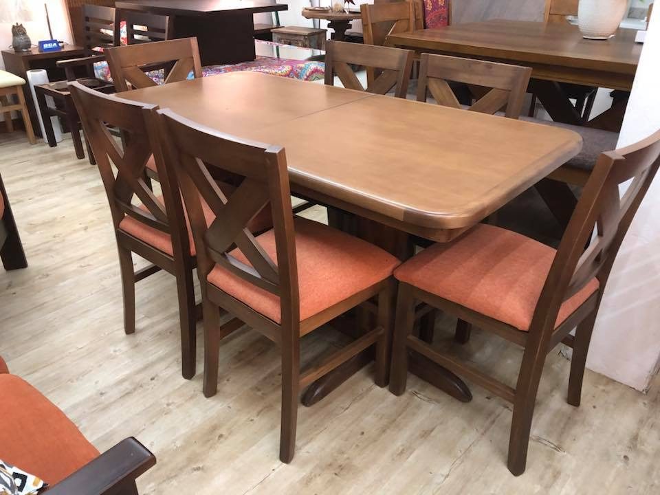 Puede ser una mesa extensible o fija , es opcional , al igual que la terminación de lustre , modelo de silla y tapizado .